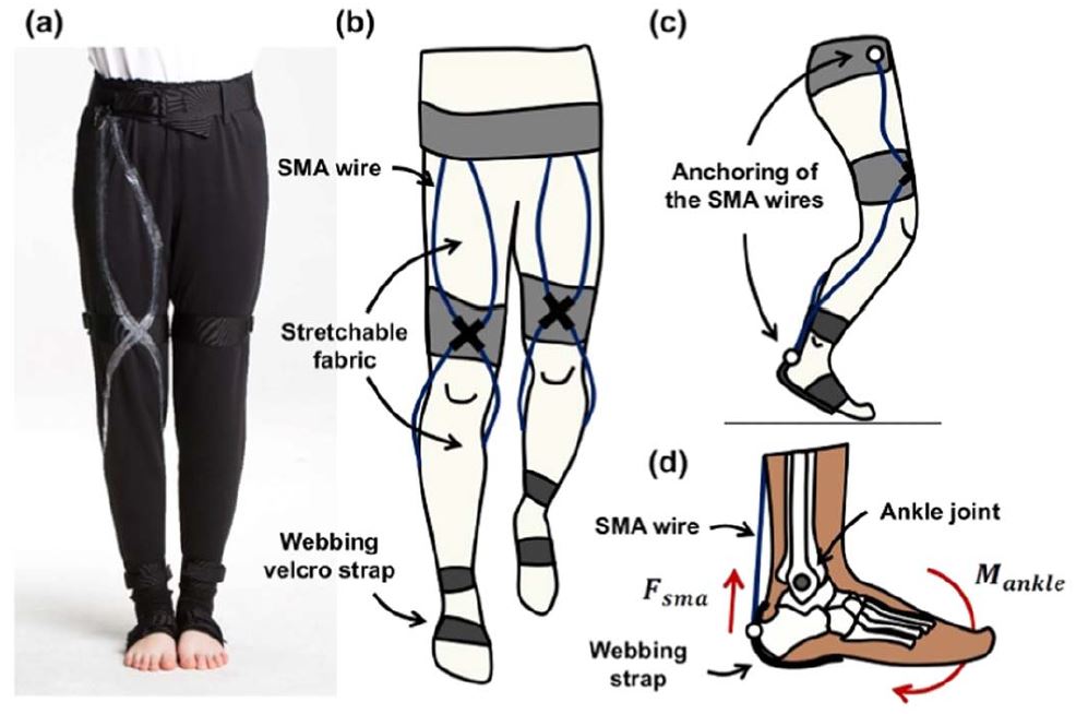 This study presents the design of a lower limb-worn, soft wearable robot that assists ankle plantar flexion using soft textiles and a shape memory alloy (SMA) wire actuator. Textile-based clothing-type soft wearable robots, the smart clothes in short, are proposed to build a soft exoskeleton that is inherently lightweight and comfortable for the wearer. SMA wire actuators are embedded in the smart clothes to provide assistive forces to the wearer. The SMA wire actuator is a low-profile wire-type artificial muscle actuator, which can be embedded on the textile without any extruded parts on the clothing. We have built an SMA wire actuator-embedded smart clothing that is able to provide ankle assistive force without rigid kinematic mechanisms. The smart clothing has a mass of 428.5 g without a power battery, and it can generate an ankle moment of 100 N cm in each ankle during walking.